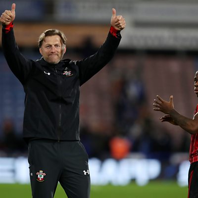 Manager Ralph Hasenhuttl speaks to Adam Blackmore after win 3-1 Premier League win.