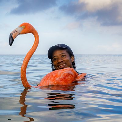The small island of Curaçao in the southern Caribbean is home to a flock of flamingos. One of them - Bob - was injured in an accident in 2016 and since then he has been living with veterinarian Odette Doest. Bob has also become an ambassador for Odette's NGO, Fundashon Dier en Onderwijs Cariben (FDOC), and helps her raise awareness about protecting the birds' habitat. Image: Vet Odette Doest swimming in the sea with Bob the flamingo Credit: Jasper Doest