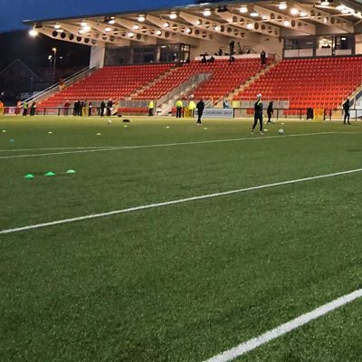 Kevin Deery, Derry City's assistant manager, talks with Eric White after Derry City's victory of Sligo Rovers. Derry won 2-0 at the Brandywell.