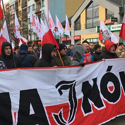 For some in Poland the Cursed Soldiers are national heroes; for others they are murderers. A march in celebration of a group of Polish partisans fighting the Soviets has become the focus of tension in a small community in one of Europe’s oldest forests. Those taking part believe the partisans – known as the Cursed Soldiers – were national heroes, but others remember atrocities committed by them 70 years ago. Some partisans were responsible for the burning of villages and the murder of men, women and children in and around Poland’s Bialowieza forest. The people living the forest are Orthodox and Catholic, Belorussian and Polish; this march threatens to revive past divisions between them. Many believe that far-right groups have hijacked this piece of history to further their nationalist agenda. For Assignment, Maria Margaronis visits the forest to find out why this is causing tensions now; why the locals feel the march is making them feel threatened; and how this reflects wider political rifts in Poland today. Produced by Charlotte McDonald. (Image: March through the town of Hajnowka to celebrate the Polish partisans known as the Cursed Soldiers. Copyright: BBC)