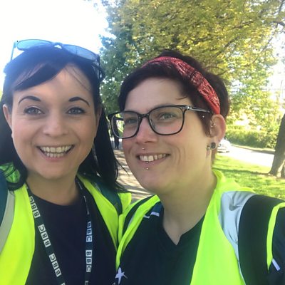 Runner and fundraiser Stacy chats to Lucy.