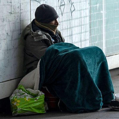 London's homeless have many problems but finding food is not one of them, according to one charity worker. Martin Stone, who runs the Muswell Hill Soup Kitchen, tells Emily Thomas there is so much surplus food in the city and so many charities distributing it, that if you're well enough to move from one soup kitchen to another there's no reason to go hungry. (Image: Homeless man seated on ground. Credit: Getty Images)