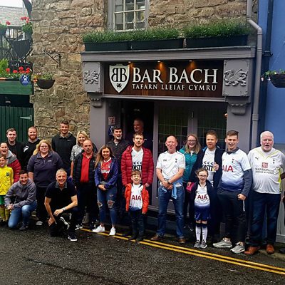 Dylan Jones a'r criw ynghanol cefnogwyr Spurs a Lerpwl yng Nghaernarfon