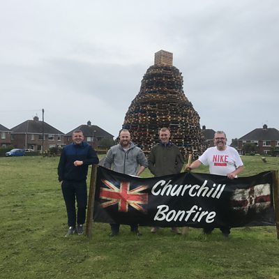 A group of bonfire builders in Bangor contribute to a project run by their former teacher