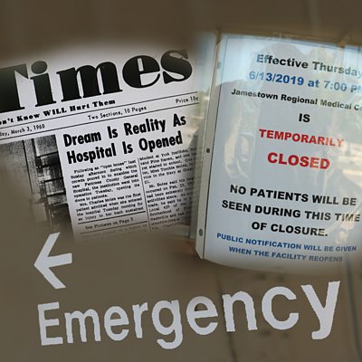A small town goes on life-support after its lone hospital closes. The story of Jamestown, Tennessee, recorded in the emotional hours and days after its 85-bed facility shut. Rural hospitals are closing across the United States, leaving patients dangerously exposed. Can Jamestown buck the trend and reopen? Produced and presented by Neal Razzell. Image: Montage – 1960s headline announcing hospital opening with sign announcing the 2019 closure of Jamestown Regional Medical Centre. Credit: BBC/Neal Razzell