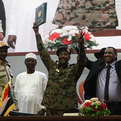 'A good step in the right direction' The sovereign council that will oversee Sudan's transition to democracy is due to take office in the next few hours. Generals and protest leaders agreed on its final composition late on Tuesday, four months after Sudan's longtime ruler, President Omar al-Bashir, was forced from power. Newsday spoke to Hafiz Mohammed, a Sudanese opposition activist who is Sudan coordinator for the human rights organisation, Justice Africa. (Picture: Abdel Fattah al-Burhan (C), the chief of Sudan"s ruling Transitional Military Council (TMC), during a ceremony where he signed a deal paving the way for civilian rule, accompanied by Mohamed Hamdan "Hemeti" Dagolo (2nd-L), commander of the Rapid Support Forces paramilitaries. Credit: EBRAHIM HAMID/AFP/Getty Images)