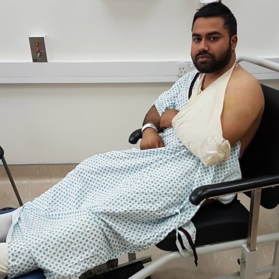 Sajid Rahman was attacked while delivering food for UberEats in east London. A gang stole his moped and left him with serious fractures to his arm and foot. Sajid tells Emily Thomas it's not the first time he's felt unsafe doing his job and says he's too afraid to deliver food again. (Picture: Sajid Rahman in hospital. Credit: BBC)