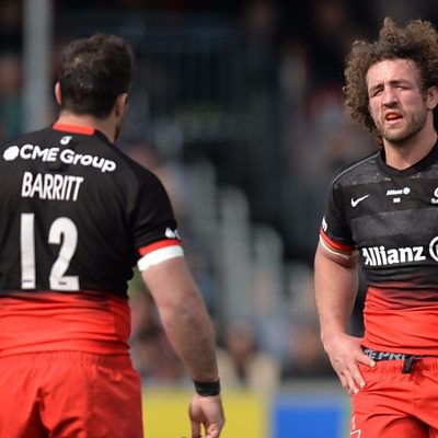 James Hand speaks to Jersey Reds chairman Mark Morgan, after Saracens are handed a 35 point deduction and £5m fine by Premiership Rugby.