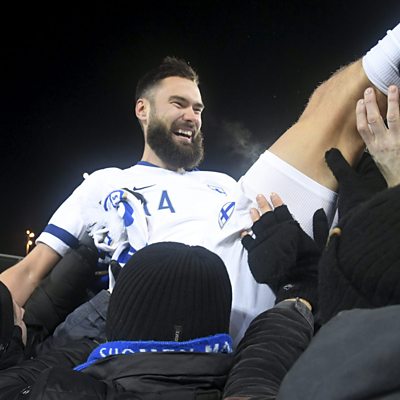 After 112 years, Finland's men finally qualify for a major tournament. We hear from captain Tim Sparv on the team's cultural diversity, goalkeeper Lukas Hradecky on his post-playing plans of running a pub, and former keeper Antti Niemi, who's enjoying the feeling of being stopped in the street as football takes the sporting limelight from ice hockey. Photo credit: Finnish captain Tim Sparv celebrates with fans after qualifying for UEFA Euro 2020. (AFP/ Finland OUT)