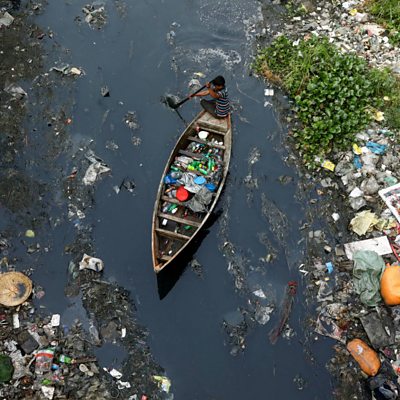 The High Court has ordered a ban on single-use plastics in hotels and coastal areas. Akbar Hossein tells Max Pearson why. (Picture: A man on a boat collects plastic materials from dirty water in Dhaka. Credit: Reuters)