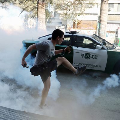 A much anticipated referendum in Chile on a new constitution has been postponed till the autumn amid safety concerns over the spread of the coronavirus. President Sebastian Piñera had agreed to the vote and a range of reforms following months of civil unrest. Since last autumn, the country has been experiencing a wave of protests with people on the streets angry at the level of inequality in the country. Amongst them thousands of university students, teachers and school children – who have been prepared to face tear gas, water cannon and rubber bullets – in a bid to change the education system in Chile. They say a privileged few have access to all the best jobs and the rest are given a substandard schooling with leaky roofs in winter, boiling hot classrooms in summer and inadequate teaching. For Assignment, Jane Chambers spent time with the protestors calling for a fairer education for all. Presented and produced by Jane Chambers Edited by Bridget Harney (Image: A demonstrator kicks a tear gas canister at a police car during a protest about the education system in Chile. Credit: Reuters/Ivan Alvarado)