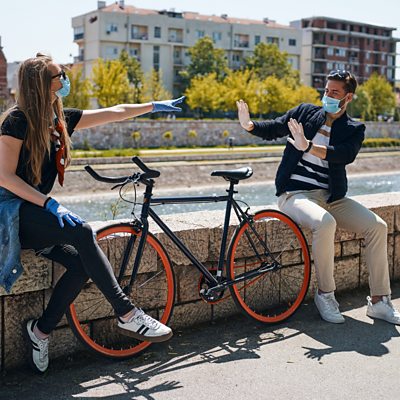 Dr Holger Schünemann, co-director of the World Health Organization's Collaborating Centre for Infectious Diseases, discusses the latest health advice on social distancing. He also takes a look at how the risks vary depending on where you and the virus are in the world. (Image: A boy and girl social distance with a bike between them Credit: Getty Images)