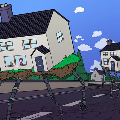 Residents get a shock when their houses sprout arms and legs and start marching down the street. Where could they be going and why?