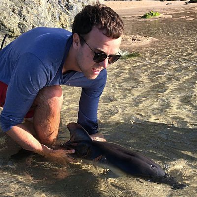 The picture shows Jago Griffiths – RNLI Lifeguard Holywell Bay. The advice is if you find a live animal in distress please call at British Divers Marine Life Rescue on 01825 765546. If you find a dead stranded marine animal please call CWT Marine Strandings hotline 0345 2012626.
