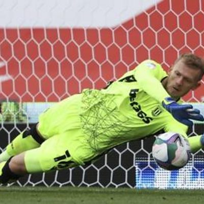 Adam Davies speaks to Lee Blakeman following Stoke's League Cup game against Blackpool