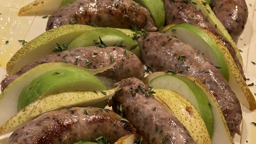Lincolnshire Kitchen with Amy Claridge. Amy creates a sausage and fruit dish on a pastry base and has a go at making her own battered sausage.