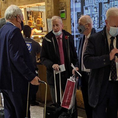 DUP MP Gregory Campbell pictured without face covering over mouth and nose at Heathrow Airport