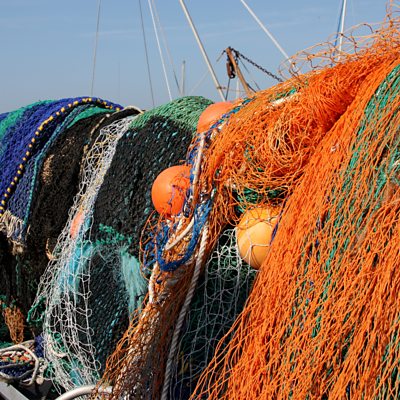 Discarded fishing nets pose a major environmental issue as they are largely made out of nylon – a type of plastic. Marine conservationist Prof Heather Koldewey collaborated with a carpet company to create Net-Works – a business that turns old fishing nets from the Philippines and Cameroon into high-end carpet tiles. So far, they have collected and recycled more than 200 tonnes of discarded nets. (Image: Fishing nets, Credit: BBC)