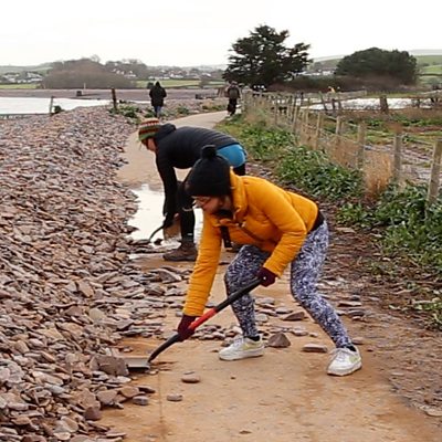 A ‘shingle digging station’ on the Steam Coast Trail invites people to shovel stones off the path. Stormy weather pushes shingle onto a stretch of the 2km trail along Dunster Beach. Sarah Ellwood, from the charity responsible for the path, tells Luke Knight about the idea. Image: Steam Coast Trail