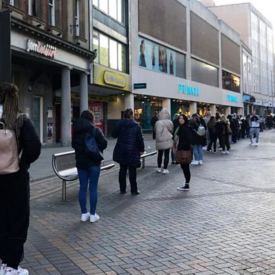 Laurie Dyche speaks to people waiting to go into the shop as it re-opens.