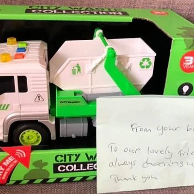 A two-year-old has been left a toy bin lorry by her 'Binmen'. Ella, 2, has spent the last year waving at the team who empty her family's bin. She's cheered, left them notes and given them Christmas gifts, while in return they have stopped, waved and beeped their horns. Today, they left her a toy bin lorry - although Ella, for the first time, had slept in and missed them! Ella's mum, Danni Milwain, spoke to BBC Radio Solent's Lou Hannan.