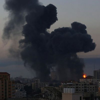 Conflict between Israeli forces and Palestinian militants has intensified. At least 40 people have died in some of the worst violence in years. Palestinian militants fired hundreds of rockets deep into Israel, while Israel carried out air strikes on Gaza. Israel's military says it is targeting militants in Gaza in response to rocket attacks on Jerusalem and other areas. The Gaza Strip is one of the most packed places on earth. A small strip of land, its borders closed, home to more than two million people. So what does it feel like to be under the barrage? The BBC's Tim Franks got a very real sense of it when he spoke to Fadi Abu Shammala in the western part of Gaza City. During their conversation an airstrike took place very near to where he and his young family were sheltering. A warning, some listeners may find this interview distressing. Photo shows. Smoke and flames rise after Israeli warplanes conducted airstrikes in Gaza City, Gaza on May 12, 2021. Credit: Getty Images
