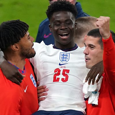 Former England international Tony Dorigo and Premier League-winning manager Claudio Ranieri talk to the BBC World Service's World Football show about England's chances, ahead of their Euro 2020 final with Italy. Gareth Southgate's side have been hailed for their spirit and skill en route to the big game, but will that be enough for them to lift the trophy? Image: Tyrone Mings and Conor Coady lift up Bukayo Saka following England's 2-1 win over Denmark at Euro 2020 (Credit: Mike Egerton/PA Wire)