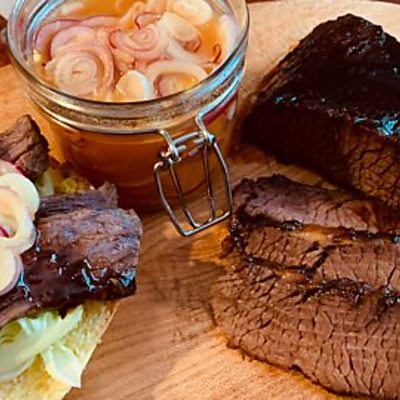 Whiskey Cured Brisket with Whiskey Honey Glaze, Mustard Pickled Onions and Brioche