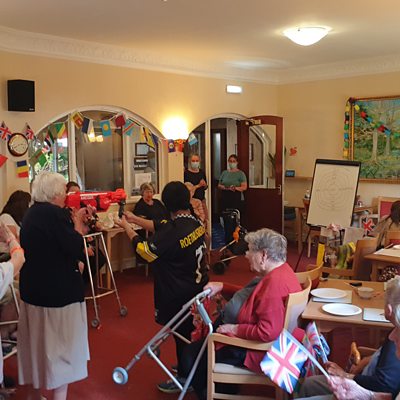 Anna Foster talks to Elaine from Eothen care home in Whitley Bay about their alternative Olympics event including paper aeroplane javelin and paper plate discus.