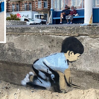 Street artist Peachy tells BBC Radio Solent he's behind three new pieces of street art which has appeared in Weymouth. Only one was "tagged" with his name. The anonymous street artist spoke to us on the condition that we keep their anonymity, so we've disguised his voice. In this exclusive radio interview, Peachy tells us some of his original plans were scuppered by work that Banksy took credit for.