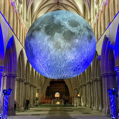 Luke Jerram's sculpture, which is seven metres in diameter, is hanging in the nave. The internally lit sphere features NASA imagery of the lunar surface. Claire Carter talks to the artist about his work and his moon's journey around the world to more than 30 countries.
