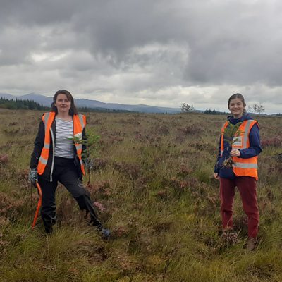 Leisa Gwenllian yn helpu i adfer mawndir ac yn sgwrsio gydag Daniel Goodwin Cymdeithas Eryri a Bethan Beech o'r Ymddiriedolaeth Genedlaethol.