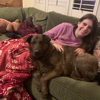 Ariel Jackson a'i chi Puck sydd wedi bod yn dysgu Cymraeg yn ystod y pandemig