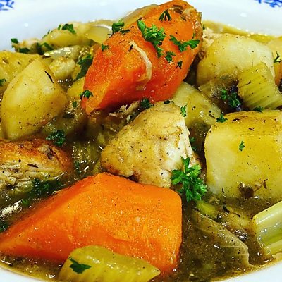 Recipe: 5 medium chicken fillets, cut into chunks 1 tbsp plain flour 1 tbsp dry mustard powder 1 tsp salt 1 tsp pepper 2 medium onions roughly chopped 3 medium carrots cut into large chunks 3 ribs celery roughly chopped 1 tbsp butter 2 tbsp rapeseed oil 4 medium potatoes chopped into large pieces 1 tsp dried thyme (1 tbsp if using fresh) 1 tsp dried parsley (1 tbsp if using fresh) 1 tsp dried rosemary (1 tbsp if using fresh) 3 dried bay leaves 1 litre chicken stock Extra parsley to serve 1. In a small bowl, mix together the flour, mustard and seasoning. Sprinkle this over the chicken pieces. 2. Heat a heavy based frying pan or casserole dish on the hob, before adding the butter and oil. When they are sizzling place the chicken in and fry in batches with the pan over a high heat for a few minutes on each side until golden. Then remove the chicken and keep warm. 3. Add the onion, carrot and celery to the juices and cook over a medium heat for 5 mins until starting to become golden. Then add the herbs, the potatoes coating well in the pan juices. 4. Return the chicken to the pan and bring everything together with the chicken stock. Bring the pan to the boil and simmer for approximately 30 mins until the potatoes are tender and the sauce is thick. Check for seasoning and serve with extra parsley on top. Alternatively this dish may be done in the oven at 180*C or slow cooker.