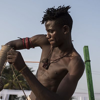 Dambe champion, Dogon Aleka, explains the rules of the sport and says fighters must accept the brutality and the risks of fighting. (Photo: Dogon Aleka wraps his fighting hand. Credit: Getty Images)