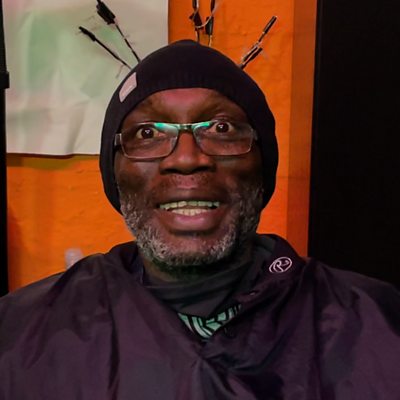 Rev Geoff Eze talks to light painter Babs Balogun in his studio space at Spode.