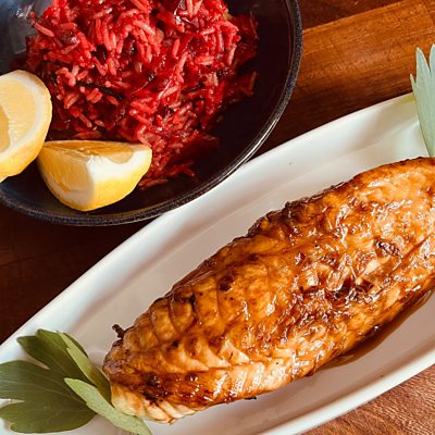Whiskey Glazed, Tea Smoked Monkfish with Spiced Beetroot Pilau