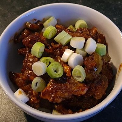 RECIPE: Ingredients: 1 egg 30g cornflour 250g rump steak 1 glove of garlic 2.5cm fresh ginger, grated 1/2 red pepper, sliced 1/2 yellow pepper, sliced 100ml beef stock 1 spring onion, sliced And for the sauce: 2 tbsp soy sauce 1 tbsp sweet chilli sauce 1 tbsp tomato ketchup 1 tbsp honey 1 tsp tomato puree Squeeze of lemon juice