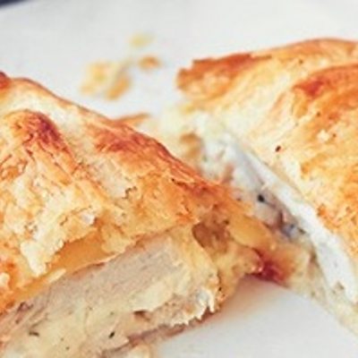 RECIPE: Ingredients: 4 chicken breasts 1 pack pre rolled shortcrust pastry sheet 3 onions Fresh thyme Lemon juice Garlic cloves Mushrooms Cream cheese/ Philadelphia Handful of spinach Instructions: In a roasting pan, put the four chicken breasts. Add enough water to cover base of pan. Place fresh thyme, salt and pepper on top of chicken. Cover and roast on 180 degrees for 35 mins or until cooked through. Take out of oven and set aside. Next, sauté the onions and mushrooms together in a pan with a little oil. Add spinach and cook through until wilted. Unroll the pastry. Spread the soft cheese all along the centre of the pastry. Next, spread the mushrooms and onions on top of soft cheese. Slice chicken in half, and overlap along the base layer until it meets end to end. Thinly slice the garlic and sprinkle over the top of chicken. Next, fold pastry over to meet on the middle and fold over the ends - just like wrapping a gift. Pinch and seal. Score top lightly with a diamond pattern. Brush with milk and bake at 180 degrees for 25 mins or until golden brown.