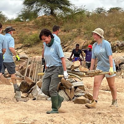 Volunteers tell Chris Craddock how they're building a dam in Kenya by hand