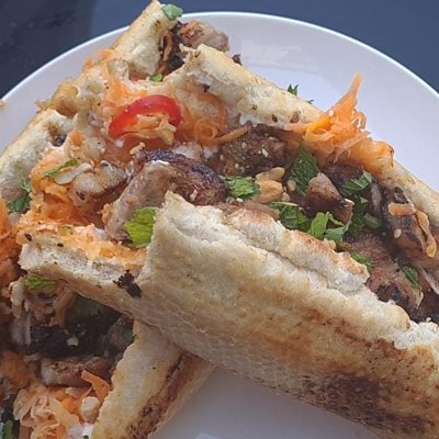 RECIPE: Ingredients: 1 baguette 200g belly pork strips 1 tbsp chopped ginger 1 tbsp chopped garlic 1 tbsp fish sauce 1 tbsp honey For the pickles: 1/4 shredded swede (makes a great alternative to Mooli or Green papaya, which can be hard to find) 1 shredded carrot 1 sliced red chilli 50g sugar 1 tbsp salt 100 ml white Vinegar For garnish: Chopped peanuts Fresh lime Fresh coriander and mint