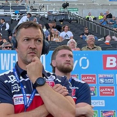 Hull KR interim coach Danny McGuire talks to Matt Dean ahead of their game at Warrington.