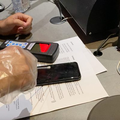 Durham based tech entrepreneur Alexander Bell tests Alfie Joey's phone for dirtiness.