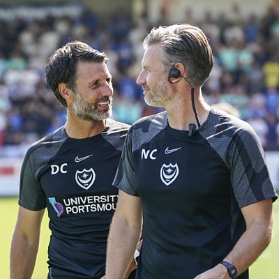 Portsmouth boss Danny Cowley speaking to Andrew Moon after their 2-0 win at Cheltenham