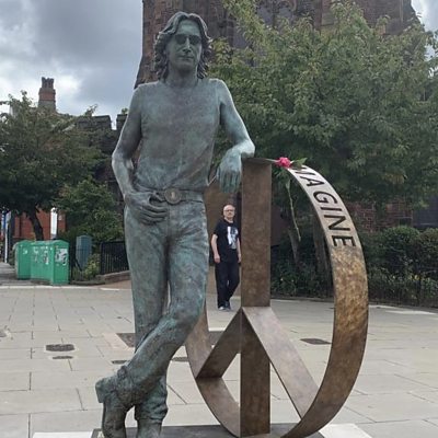 David talks to the sculptor of the John Lennon Peace statue at Penny Lane.