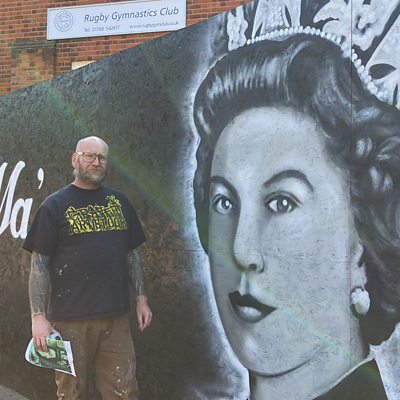 A new mural has been painted today in Rugby as a tribute to the Queen. The mural has been painted on a large wall in front of the Rugby Gymnastics Club on the Lower Hillmorton Road. Edward Knight Estate agents now own the land, and the building, and it was their idea to create a mural for the Queen. The artist is David Brown from Graffitiartist.com, he’s from Birmingham and based at the Custard Factory. Dan Sambell was passing and stopped to find out more and stay to see it completed.