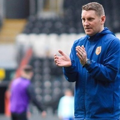 Andy Dawson speaks to David Burns after their 4-2 win against Rotherham.
