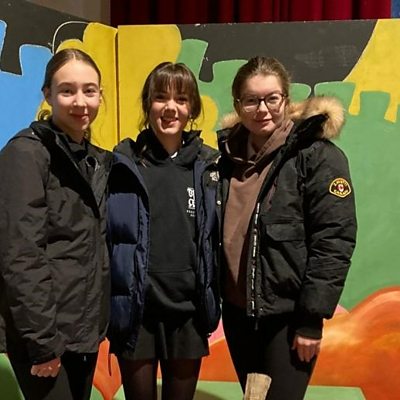 Julia Lewis speaks to Harriett, Eve and Evie-Mae from 'Cinderella' at the Milton Rooms.