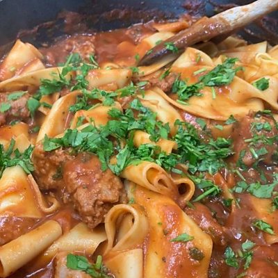 Sausage Pappardelle. Ingredients:- 500g Fresh lasagne sheets 2 cloves garlic Large Bunch Flat Leaf Parsley Olive Oil 4 Andys Gluten Free Sausages or Traditional Sausages 2 tsp Fennel Seeds 1 tsp Oregano Red Wine 400ml Passata Parmesan Cheese Method:- Boil the kettle. Cut the lasagne sheets lengthways into 3cm strips to make Pappardelle. Peel and finely slice the garlic. Finely chop the top leafy half of the parsley, then the stalks, keeping them separate. Put a 28cm frying pan on a high heat. Once hot, put a little drizzle of olive oil into the pan, then squeeze the sausage meat out of the skin into the pan, breaking it up with your spoon. Fry and stir for 2 minutes, then add the garlic, parsley stalks and fennel seeds. Once lightly golden, add a good splash of red wine, let it cook away, then add the passata and scatter the pasta into the pan. Carefully pour in enough boiling kettle water to just cover the pasta - about 300ml. Let it bubble away for 4 minutes, or until the pasta has absorbed most of the water and you’ve got a nice rich sauce, stirring regularly and loosening with an extra splash of water, if needed. Turn the heat off, stir in the parsley leaves, then season to perfection. Finish with a grating of Parmesan and a kiss of extra virgin olive oil.