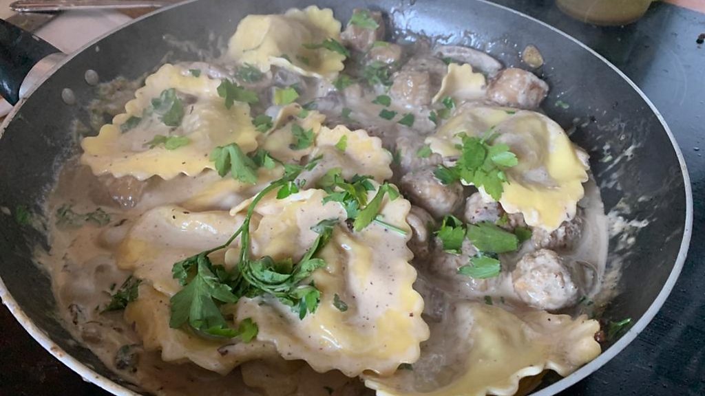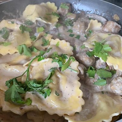 Creamy sausage and mushroom pasta A hugely economical dish that takes around 10-12 minutes to make, very easily adaptable, swap sausages for chorizo or chicken or go veggie and use kale, leeks and spinach or whatever green veg you fancy. Ingredients: • 1 x pack filled pasta (I used Lidl Deluxe porcini mushroom filled pasta) • 2 tablespoons veg oil • 6 x pork sausages, whatever your favourite is (I used pork and leek), cut into chunks • 1 tsp dried fennel seeds • 2 large flat mushrooms, sliced • 2 garlic cloves, sliced • Pinch dried chilli flakes • 60ml cream sherry (or you can use wine) • 200ml double cream (or use a tin of chopped tomatoes for a healthier option) • Chopped fresh parsley, around a handful including somer for garnish. Method: 1. Put a saucepan of water on to boil for the pasta. 2. Heat a large frying pan, add oil then add your sausages and fennel seeds and cook. 3. Once your sausages are cooked add the mushrooms, garlic and chilli, keep stirring so as not to burn your garlic. Cook your pasta. 4. Add the cream sherry, let it cook for 30 seconds or so then add the cream. Once the cream is hot then add most of the parsley. 5. Drain your pasta and add to the frying pan, mix well with the sauce. Plate up and serve topped with the remaining parsley and with a nice green salad and some crusty bread to mop up the amazing sauce.